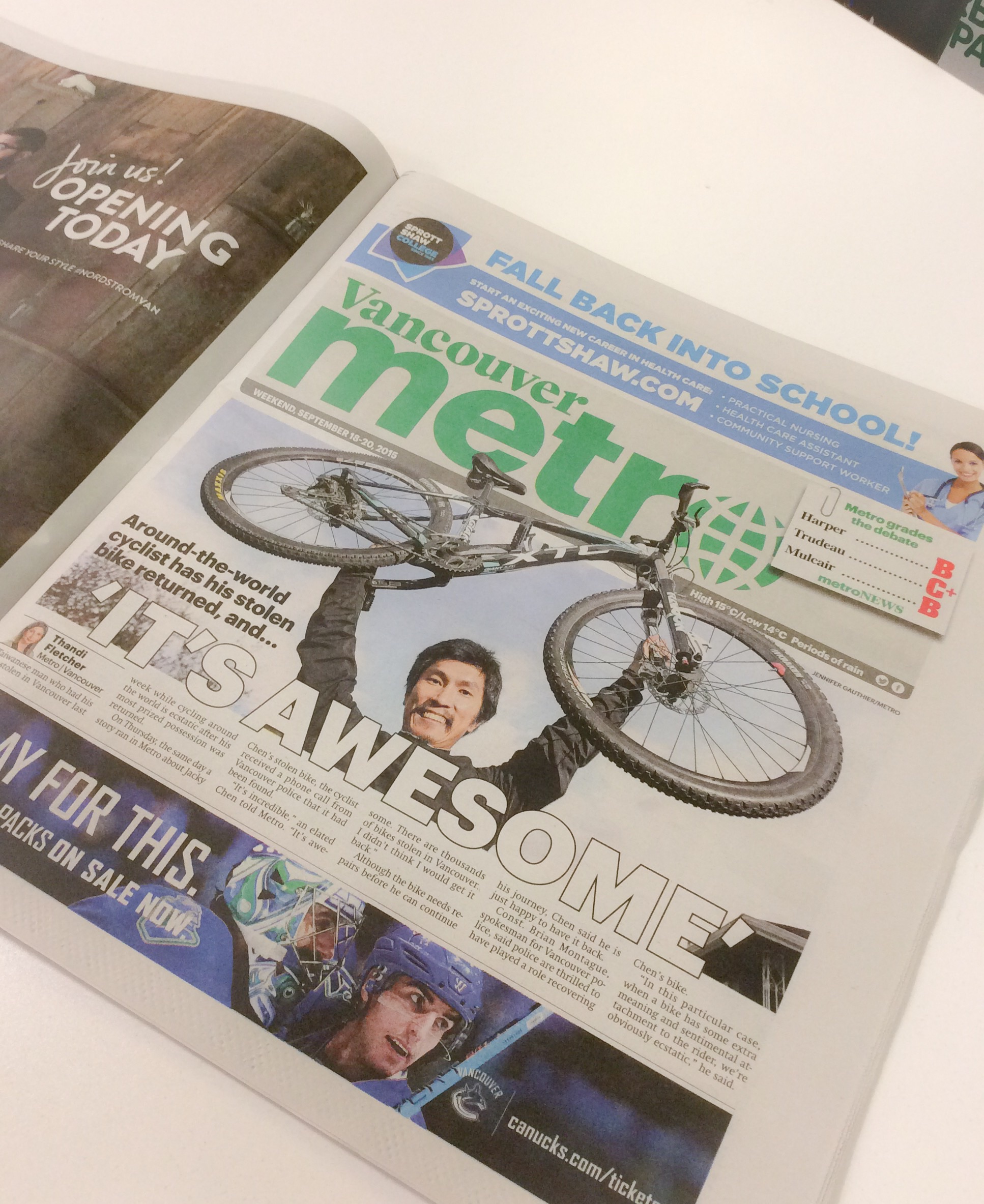 バンクーバーには2つの無料新聞があります。駅に置いてあったり配ったりしているので、電車の中で見て、見終わったら駅のリサイクルボックスにポイ。出来ます。